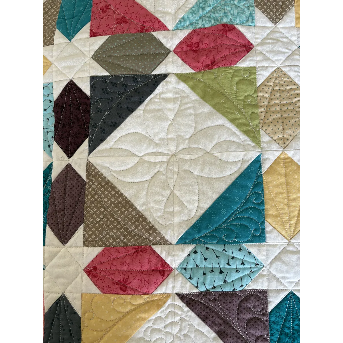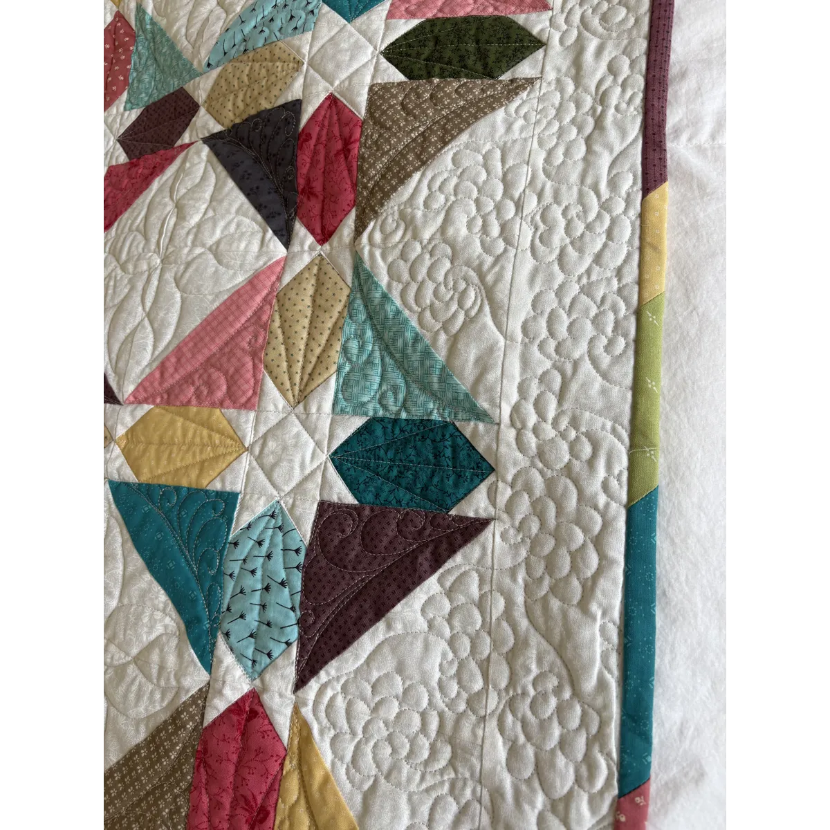 This is a group project called 'Missy'. It features an intriguing block which creates a circle effect with a secondary star pattern. Pieced with a variety of pretty coloured fabrics on a crisp looking antique white background. It is machine 'custom' quilted which shows up beautifully on the soft green coloured backing fabric. The quilt is filled with a polyester wadding which can be gently washed and air dried. It measures 66" by 66" and sits nicely on top of a double/kingsize bed or could be displayed as a wall hanging. The scrappy binding sets it off perfectly.