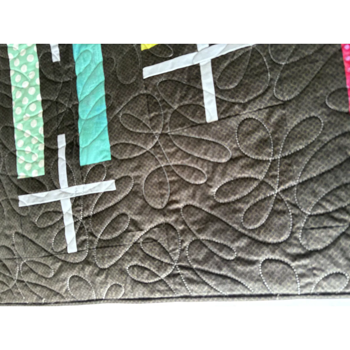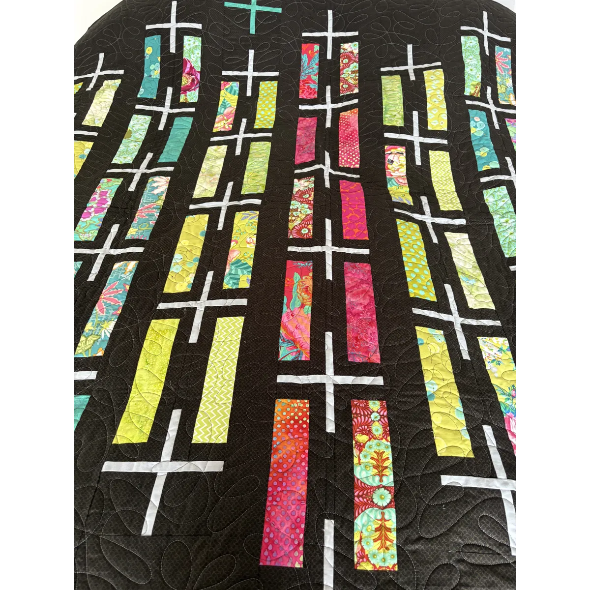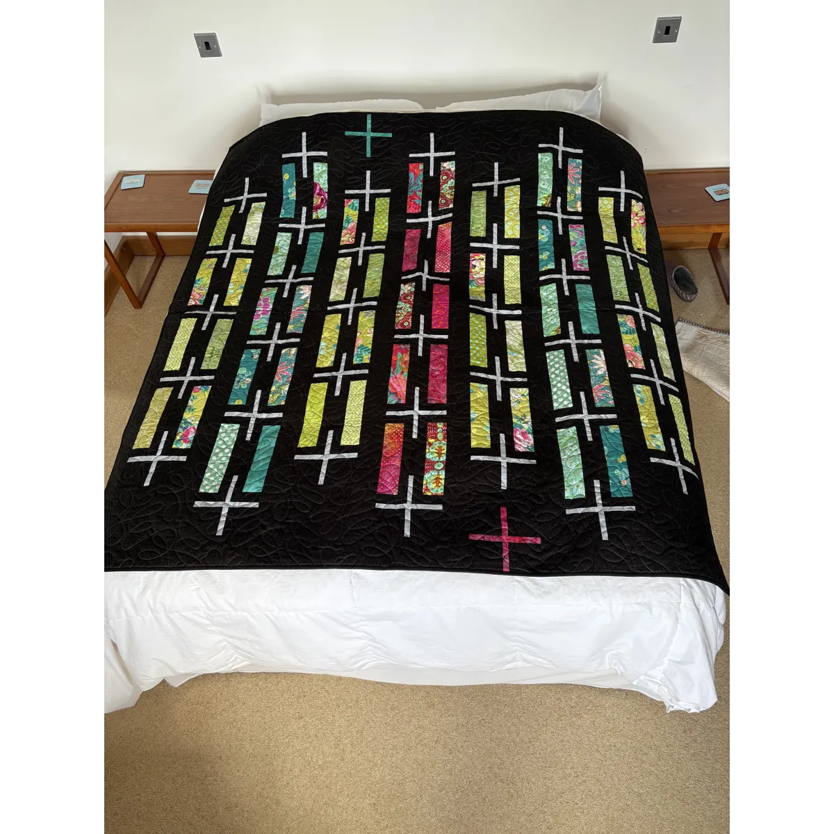 This is a group project called 'Tight Rope'. It features shining bright fabrics and crosses against a black background which gives a stained glass window effect. It is machine quilted with an all over loopy design and is filled with a polyester wadding which can be gently washed and air dried. The quilt measures 66" by 66" and sits nicely on top of a double/kingsize bed or could be displayed as a wall hanging.